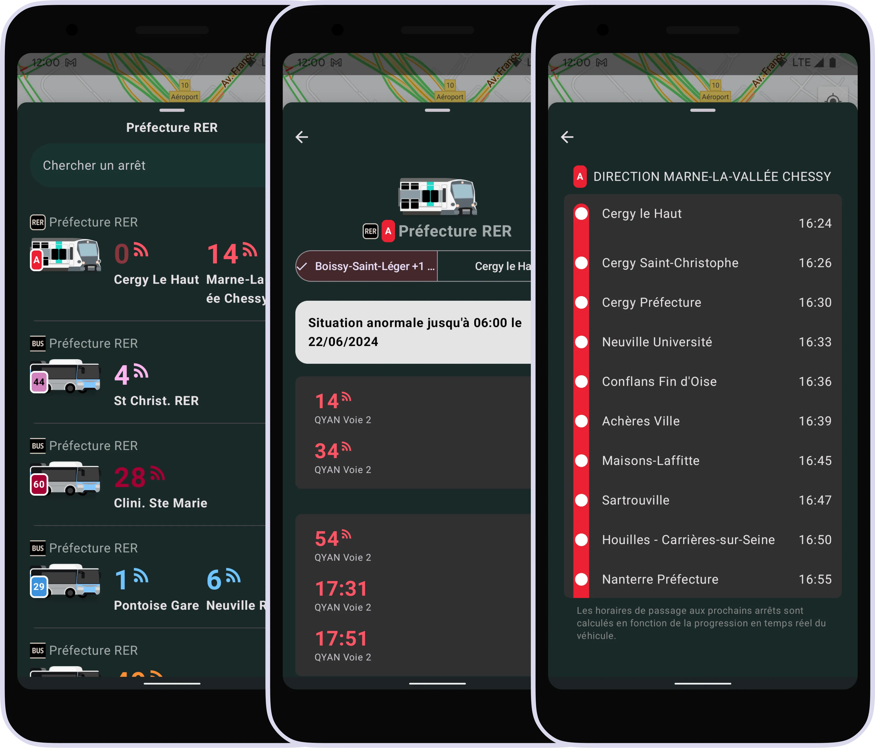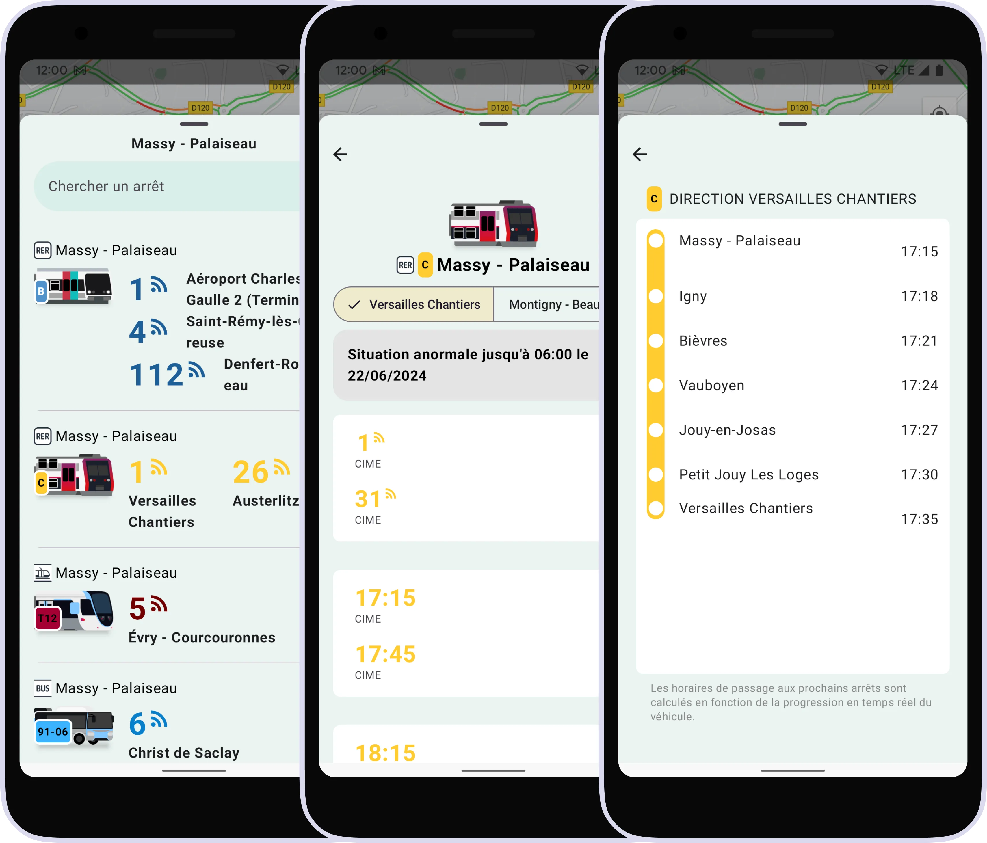 On ouvrant Wagon, toutes les lignes à proximité et leurs départs en temps réel sont affichés. En cliquant sur une ligne, on accède aux horaires de la journée pour les différentes destinations. Enfin, en cliquant sur un départ, on peut consulter les horaires de passage à chaque arrêt.